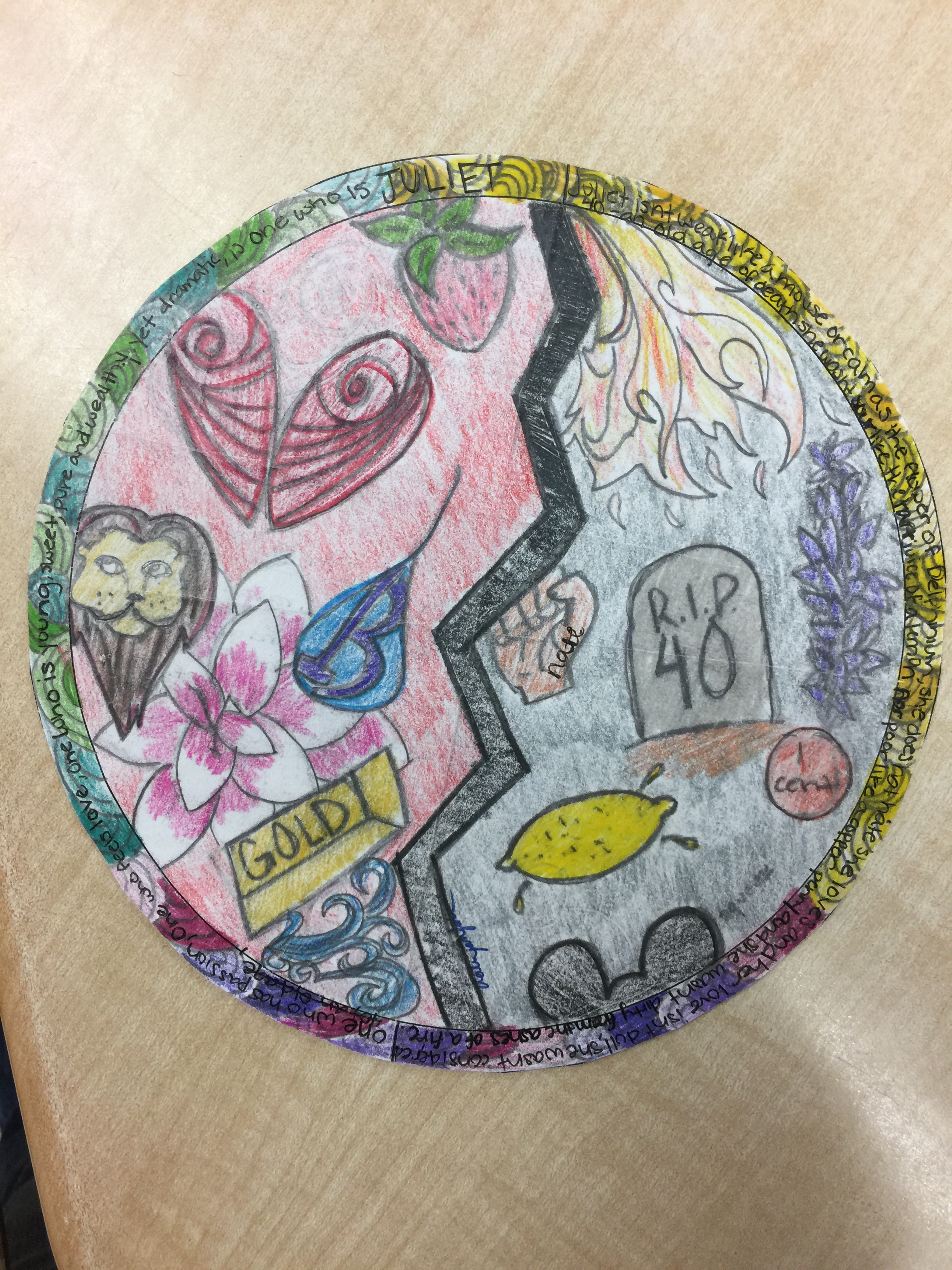 An assessment that I’ve been using for years is the character mandala from Laying the Foundations. I’ve adapted it for use with Romeo and Juliet, The Outsiders, and I’m going to try it as a person mandala with a piece of nonfiction next quarter. The reason I love the mandala is that it makes students think in a variety of ways. It is also an assessment that has steps, so I can give small check up grades during the process and make sure that no one falls so far behind that they end up with nothing to turn in.